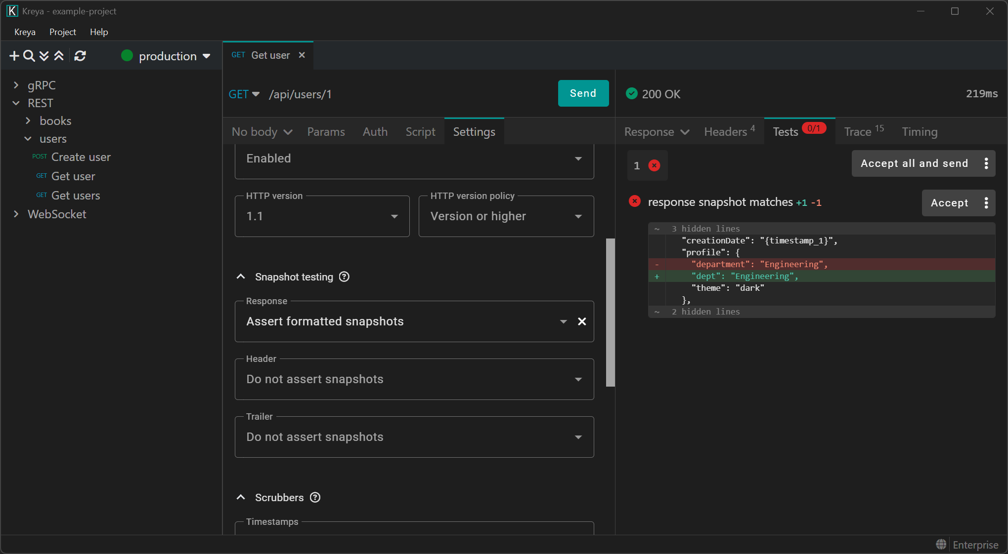 You instantly see the breaking change. If this was intentional, you press "Accept" button in Kreya, and the new structure becomes the baseline. If it was accidental, you have caught a bug before it reached production.
