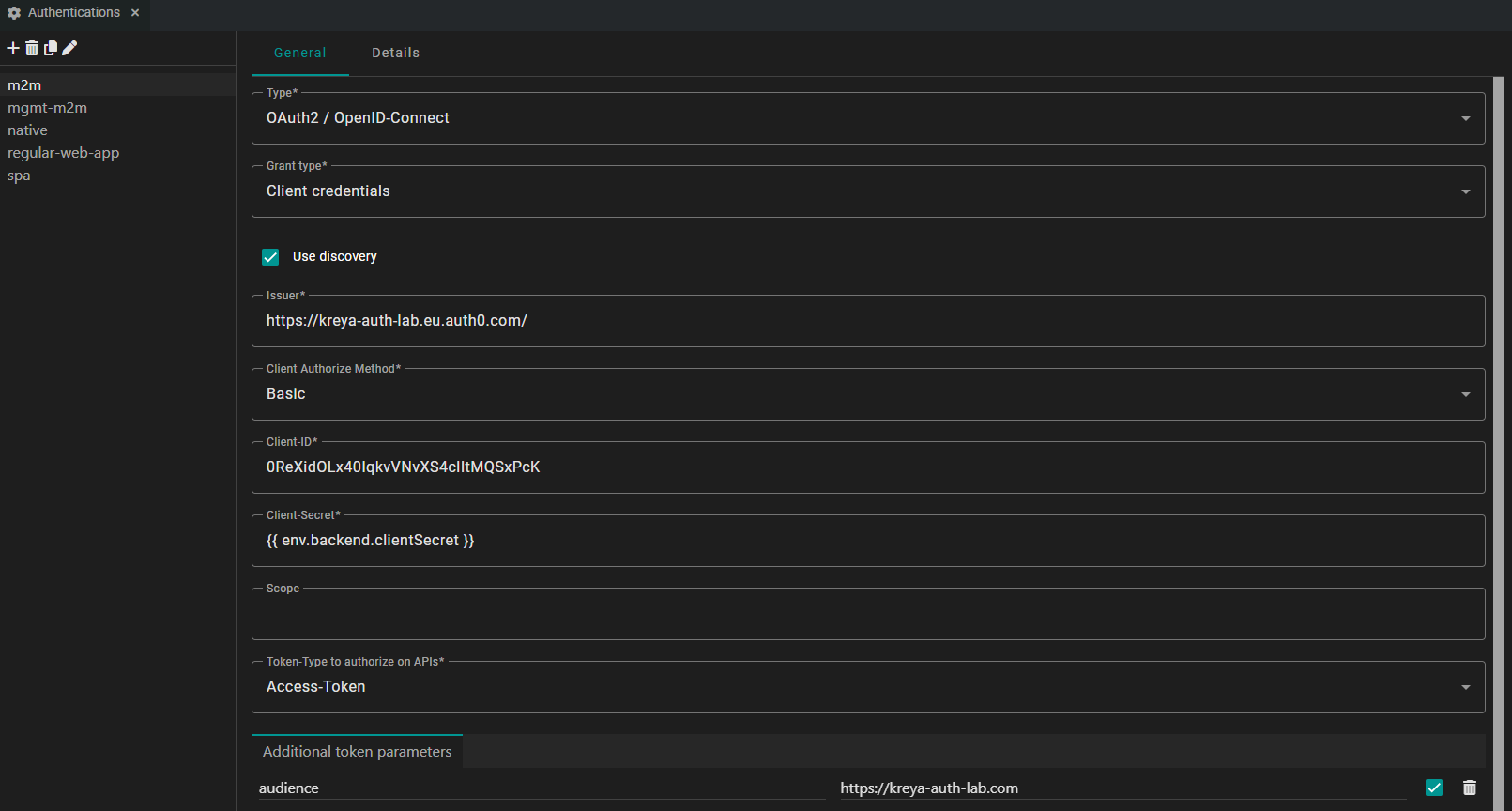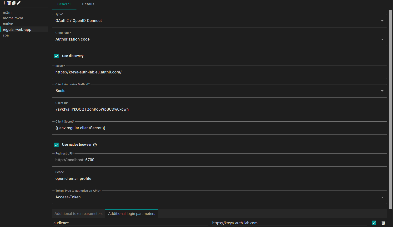 In Kreya, this setup uses the Authorization Code flow. While it looks similar to the SPA setup, we need to provide the client secret and change the Client Authorize Method. This ensures that Kreya authenticates itself to Auth0 using your application's credentials during the token exchange.