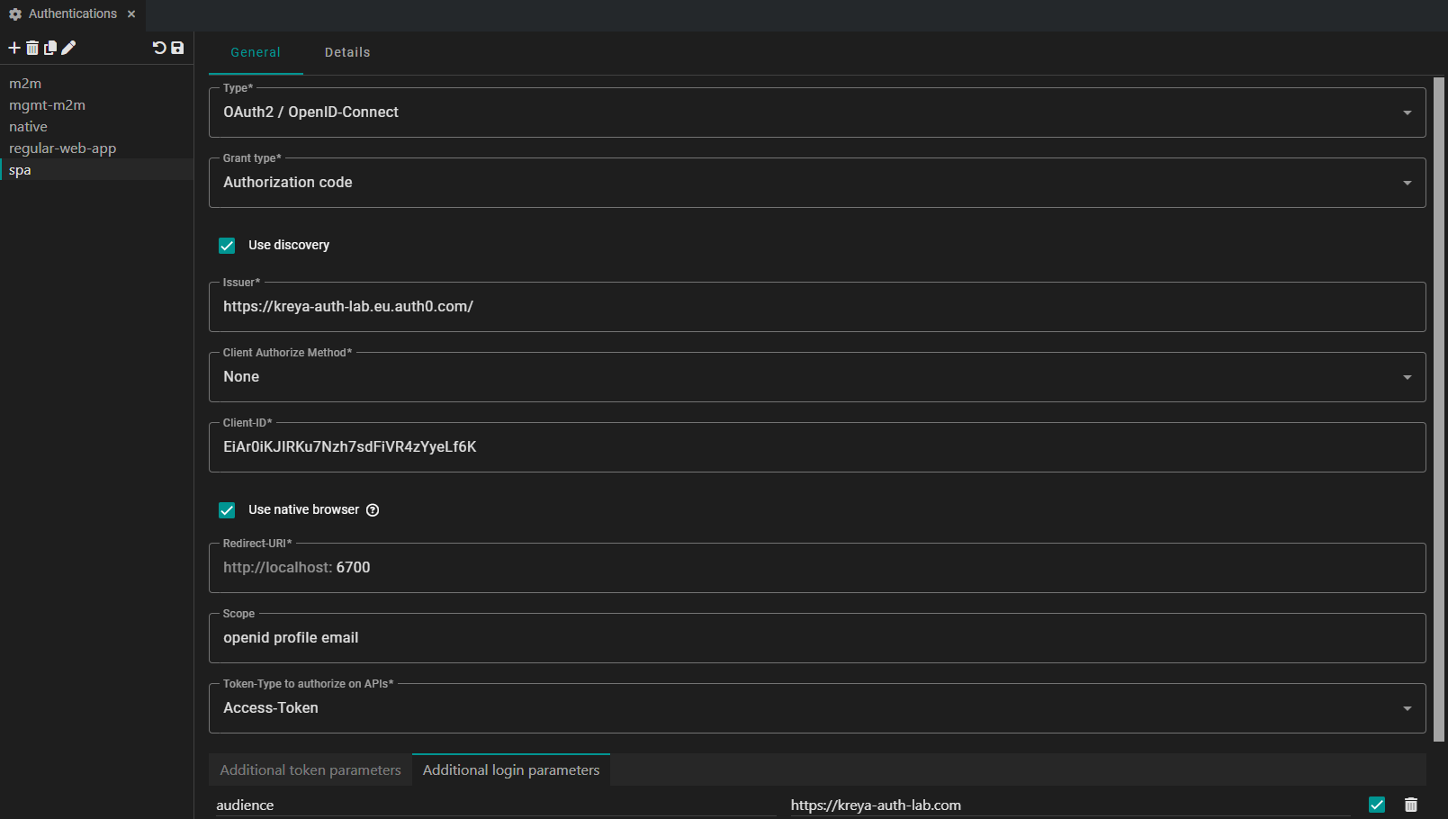 In Kreya, the configuration for a native application is identical to the SPA setup. Kreya automically manages the PKCE handshake under the hood.