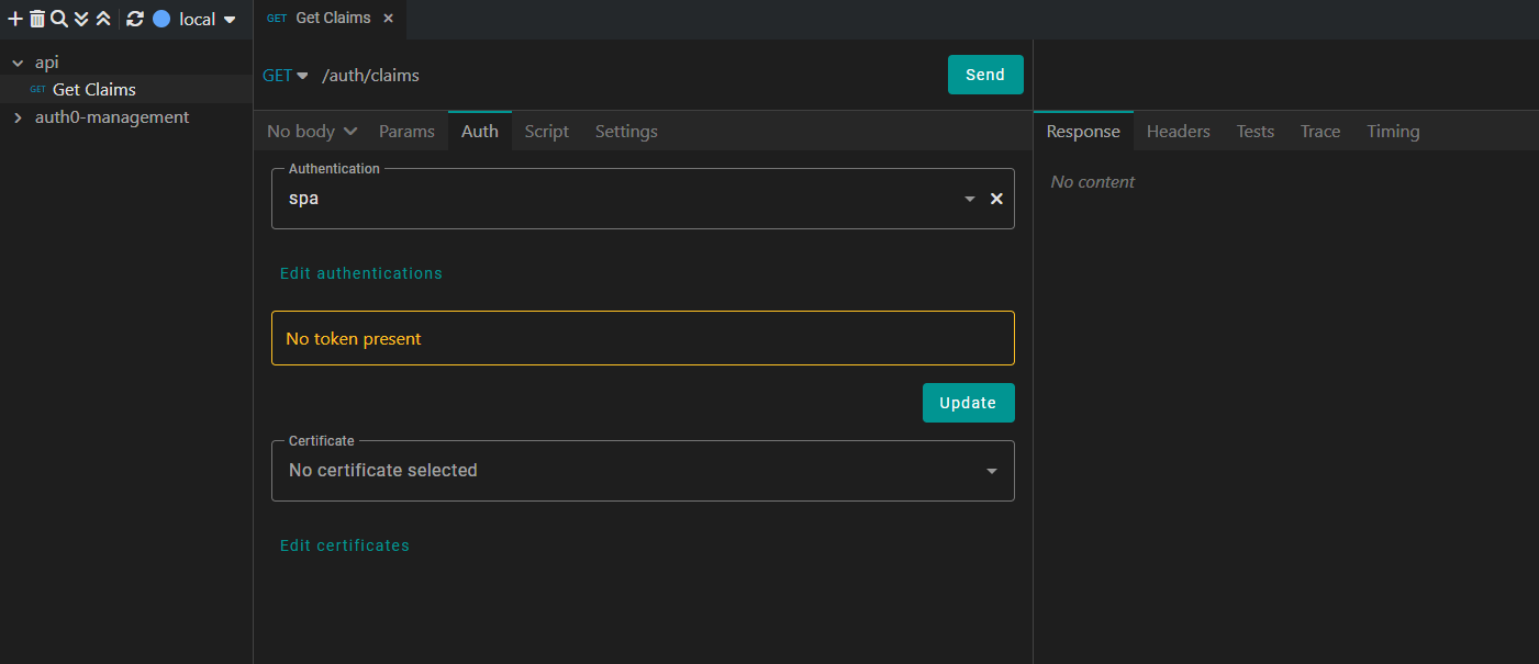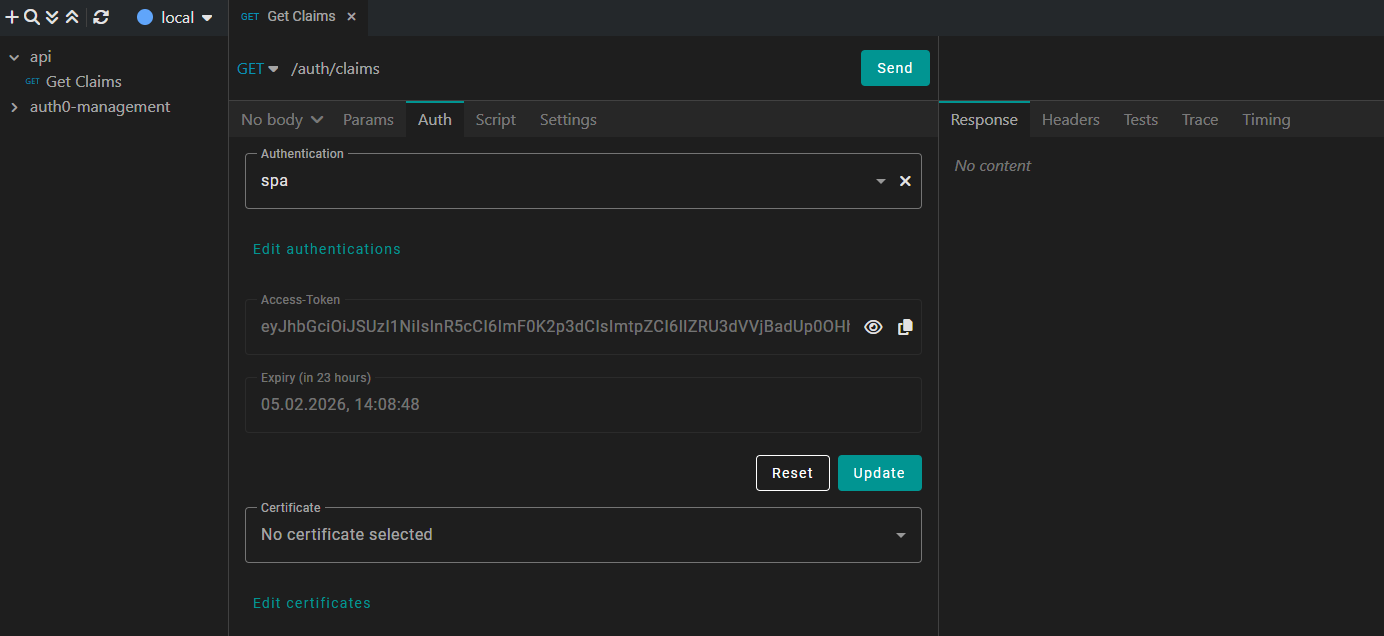 In this example, we are calling a local API, which reads all user claims of the authenticated user and returns it.